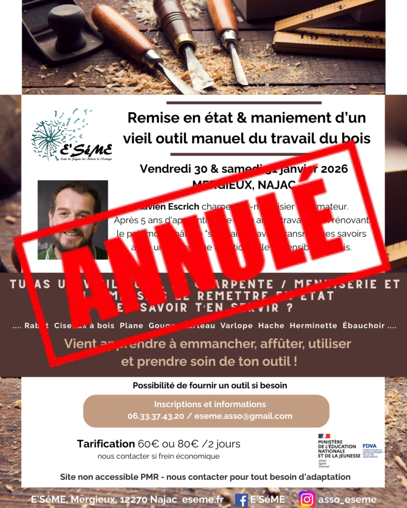 [Annulation] Journée d’initiation grand public autour de la remise en état et maniement d’un vieil outil manuel du travail du bois vendredi 30 & samedi 31 janvier 2026